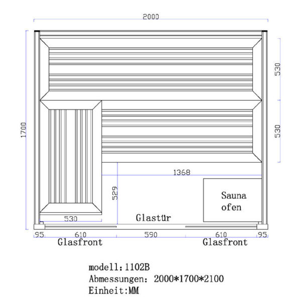 - 2000mm x 1700mm x 2100mm (Länge x Breite x Höhe)