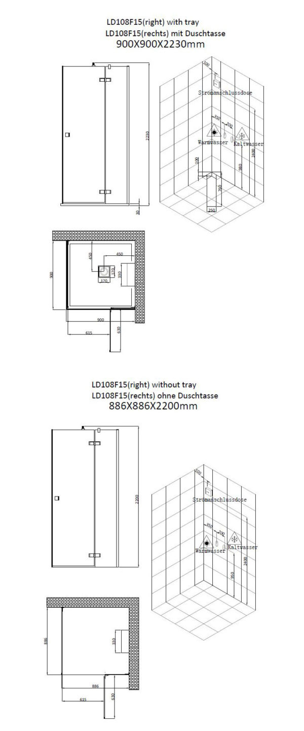 - 883mm x 883mm x 2155mm (Länge x Breite x Höhe)