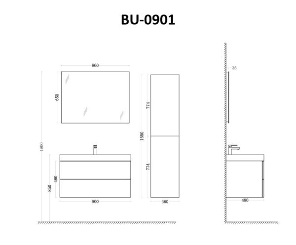 - Abmessungen Unterschrank: 900mm x 560mm x 480mm